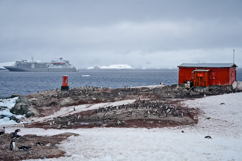 In the breathtaking expanse of Damoy Point, we stood together beneath a brilliant blue sky, our hearts swelling as it contrasted with the endless white snowfields. Amidst this serene beauty, a lonely scientist's hut whispered stories of human endeavor in this remote wilderness. Nearby, lively colonies of penguins waddled across the icy terrain, their playful antics igniting joy in our souls and breathing life into the stark landscape.